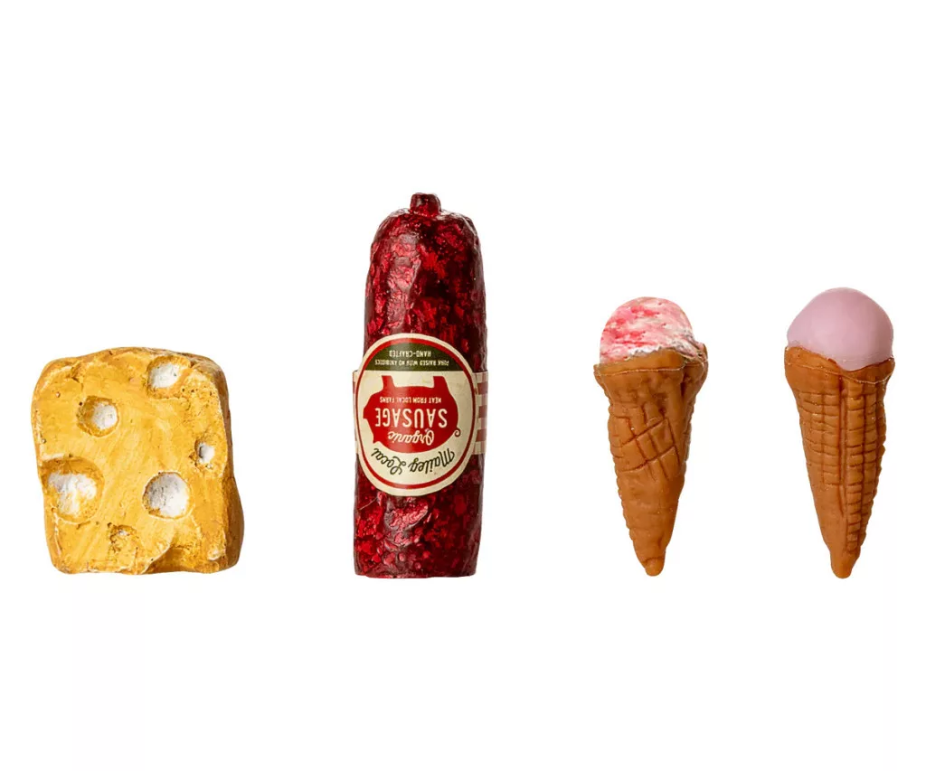 Egy konyha sem teljes hűtőszekrény nélkül – így van ez a miniatűr világban is. Ez a Maileg hűtőszekrény egérháznak tökéletesen illik a Mouse Hole Farmhouse konyhájába, és igazi játékélményt ad a gyerekeknek. A belsejében apró meglepetések várnak: sajt, kolbász és fagylalt, amelyekkel még izgalmasabbá válik a szerepjáték.