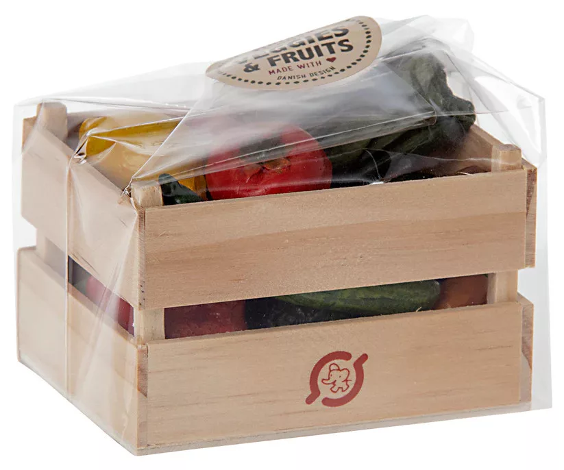 Az orvos is megmondta: egyél sok zöldséget és gyümölcsöt! A Maileg nyuszik ezt nagyon komolyan veszik – a házuk konyhájában (80 cm magas, 72 cm széles, 40 cm mély) mindig ott lapul ez a kis fa ládika, tele aprólékosan kidolgozott, kézzel festett finomságokkal. Minden darab kicsit más, hiszen a kézi festés miatt egyedi.
