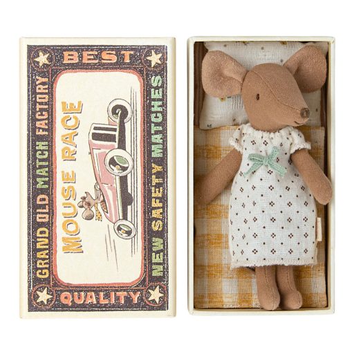 Ez a klasszikus Maileg egérke nagytestvér szerepben érkezik, készen állva a végtelen játékra. Amikor eljön az alvás ideje, kényelmesen pihen a gyufásdobozban található kis ágyikóban. Az egérke ruhái és ágyneműje egyedi mintákkal és gyönyörű színekkel készült, amelyek különleges bájt kölcsönöznek ennek a játéknak.