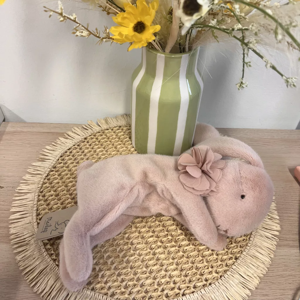 • Természetes, alvó testtartás: A nyuszi fekvő pozíciója különösen alkalmassá teszi altatáshoz, esti összebújáshoz, ringatáshoz – nem kell hajtogatni, pont úgy feküdhet melléjük, ahogy van.