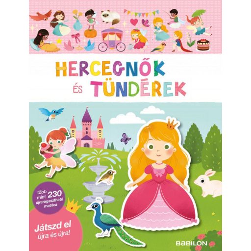 Rendezd be a hercegnők és tündérek világát, alkoss kedvedre történeteket! Ebben a füzetben mindent megtalálsz egy igazán varázslatos játékhoz: több mint 230 újra és újra felhasználható matricát, és egy füzetet változatos helyszínekkel. Kik táncolnak a bálon? Hogyan lazítanak szobájukban a kis hercegnők? Mi történik a felhők birodalmában?