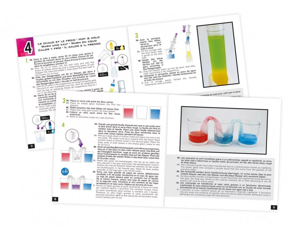 Tartalma: kémcső, fecskendő, 3 színezőanyag, színes tabletta és por állagú vörös káposzta.