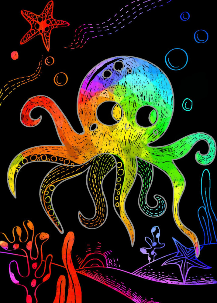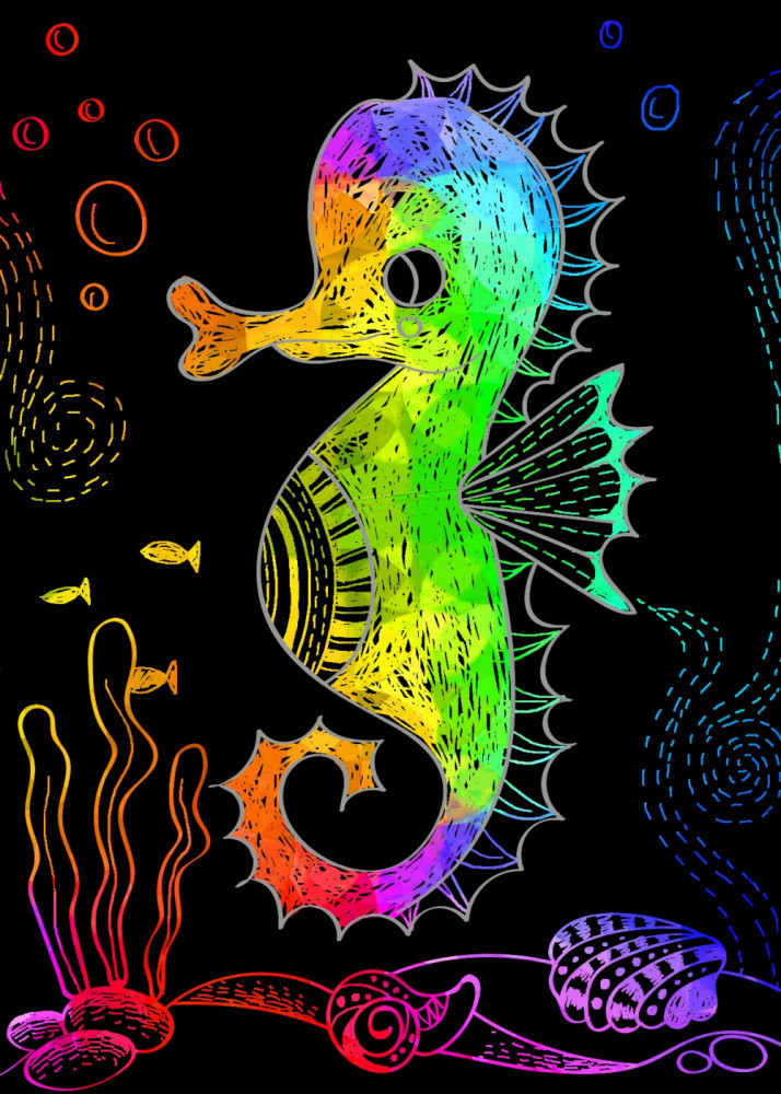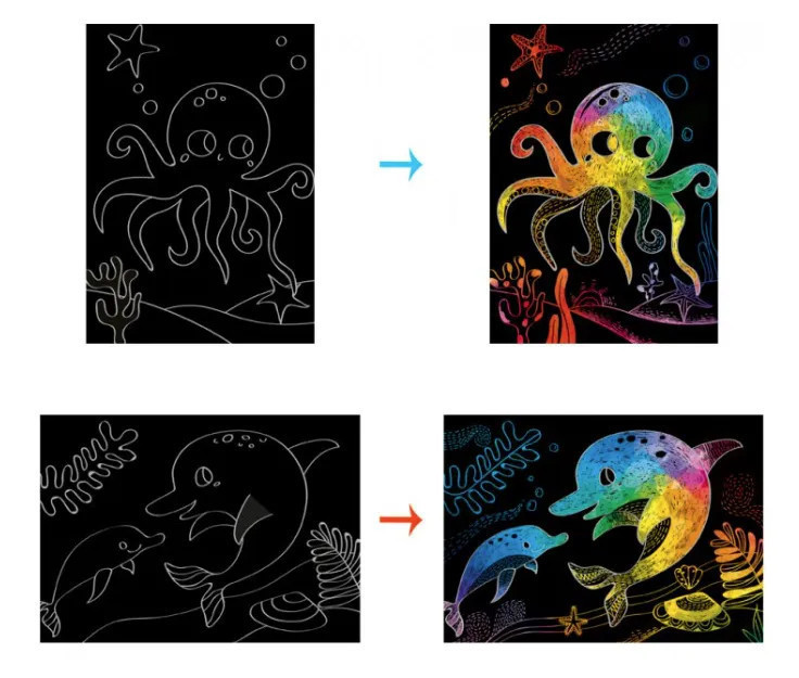Egyedülálló kreatív technika, melynek lényege, hogy a sötét papírlapokat megkarcolva vibráló színek jelennek meg, ez adja ki a formákat és a mintákat. A karceszköz minden egyes mozdulattal eltávolít a fekete festékrétegből és feltárja a színes képet. Remek készlet a rajzolás fejlesztésére és a képzelet kibontakoztatására!
