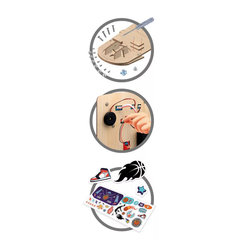A mellékelt csavarhúzóval a gyerekek biztonságosan összeállíthatják a ponttáblát, a vezérlőpanelt, a hangszórót és az elemtartót – forrasztás nélkül. A mellékelt matricákkal személyre szabhatják a palánkot. Az elektronikus ponttábla minden kosár után hangjelzést ad, visszaszámolja az időt és nyomon követi a pontszámokat. A gyerekek egyedül is használhatják a játékot vagy versenyezhetnek egy barátjukkal, és összehasonlíthatják a pontszámokat.