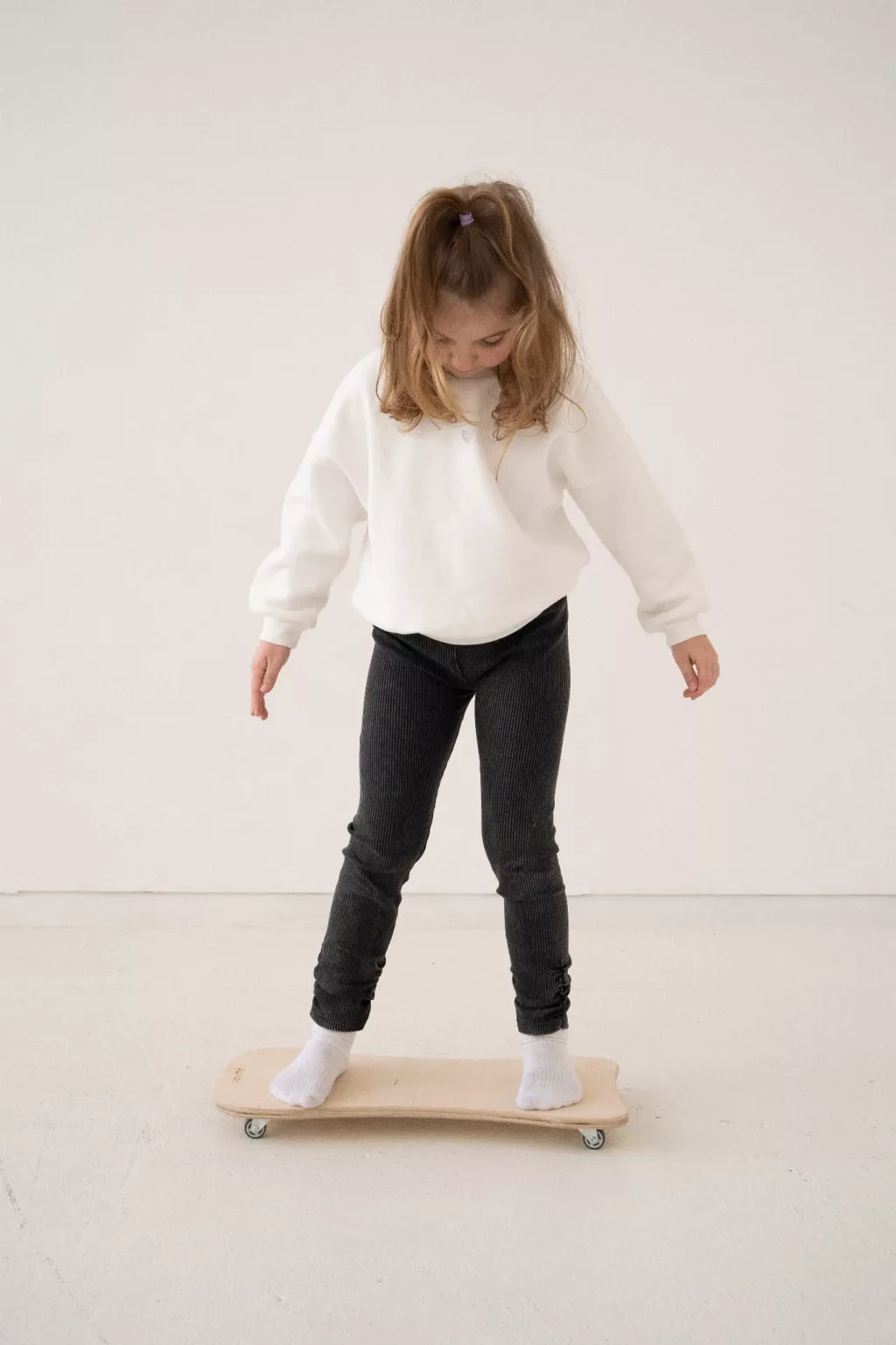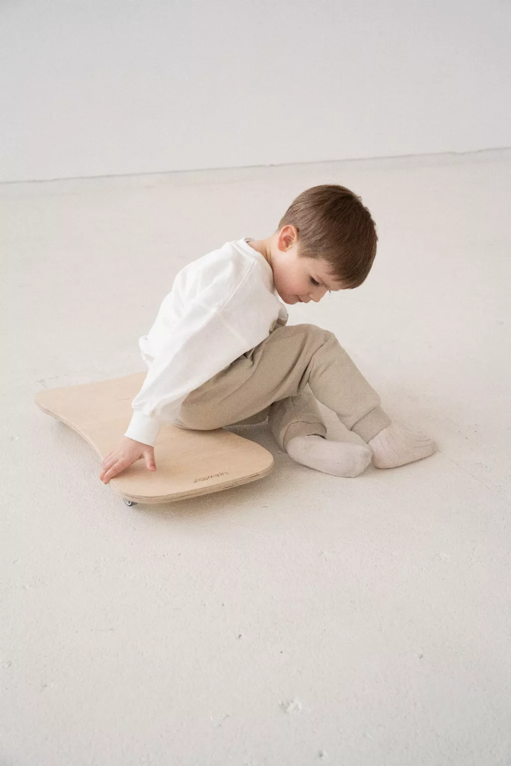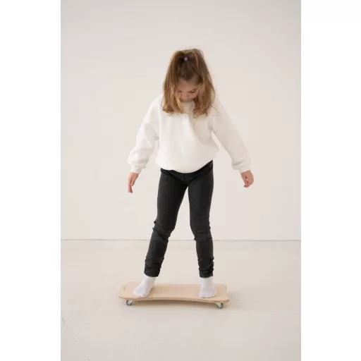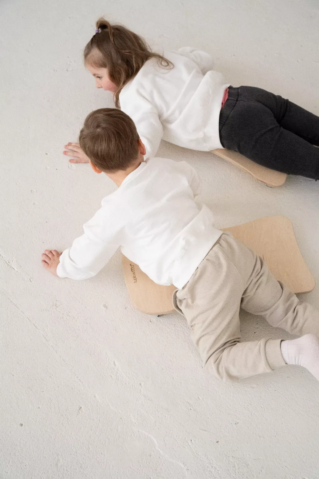 A Montessori gördeszkát úgy terveztük, hogy a gyerekek saját tempójukban fedezhessék fel a mozgás lehetőségeit. Hasalva, térdelve, ülve vagy akár hanyatt fekve is lehet rajta gurulni – így minden pozícióban más izomcsoportot aktivál, és más-más típusú mozgásélményt nyújt.