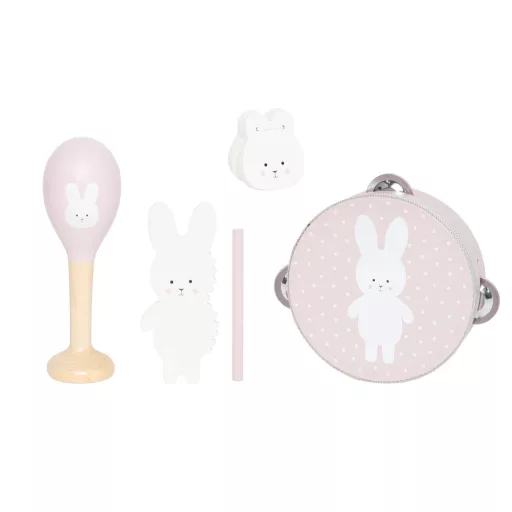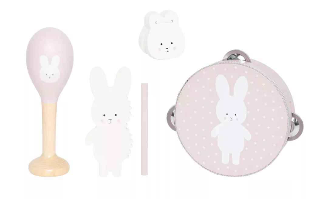 Engedd, hogy a kicsik felfedezzék a zene varázsát ezzel az imádnivaló hangszer készlettel! Ez a csomag mindent tartalmaz, ami a kis dallamok és ritmusok megalkotásához szükséges. Az összes hangszer lágy, természetes színnel és egy bájos nyuszi arccal lett díszítve. Tökéletes a gyermekek zenei, koordinációs és ritmus érzékének korai életkortól történő fejlesztésére!