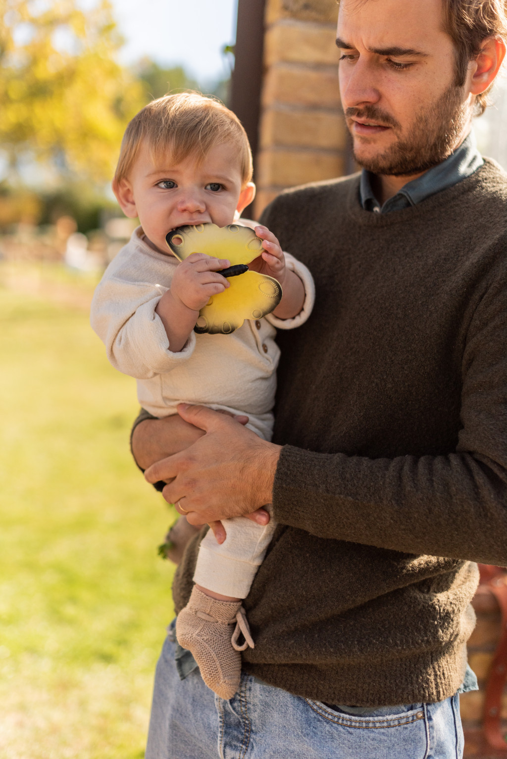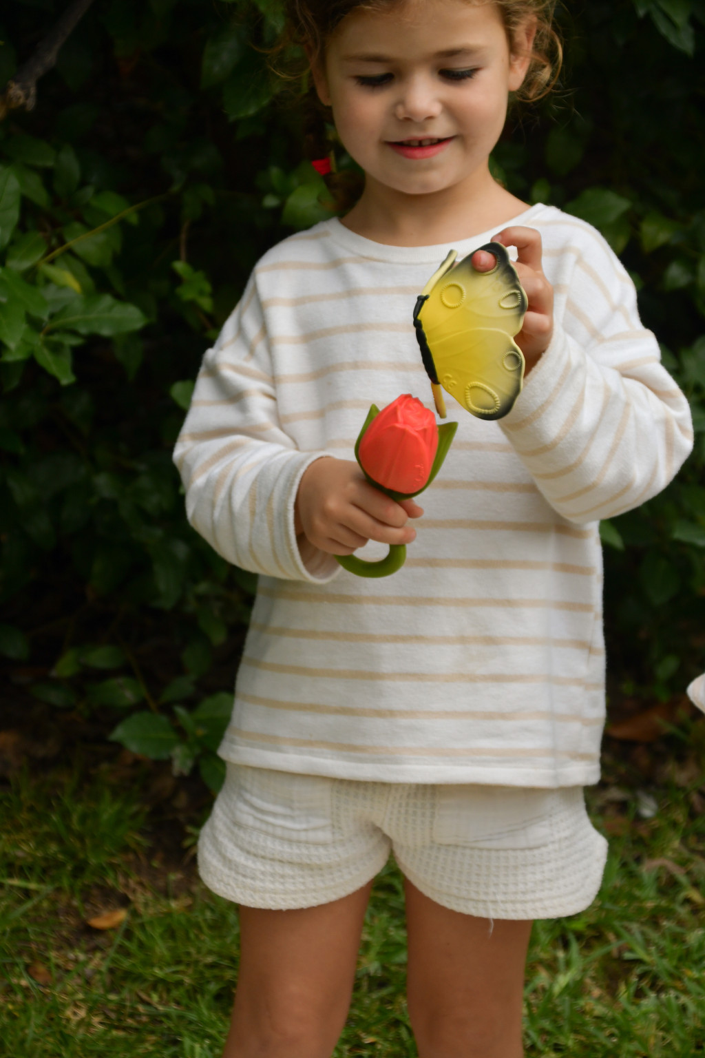 A Katia Pillangó egy különleges rágóka, amely a természet szépségét és a fenntartható játékokat ötvözi. Egy hernyóból gyönyörű pillangóvá válva, Katia inspirálja a kicsiket a felfedezésre, miközben enyhíti a fogzás kellemetlenségeit. Szárnyainak különböző textúrái gyengéden masszírozzák az érzékeny ínyt, ezzel segítve a fogzás folyamatát.