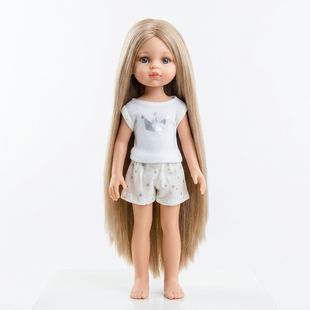 A Paola Reina Carla baba 32 cm egy igazi klasszikus, amely a spanyol kézműves hagyományokat ötvözi a modern gyerekszoba igényeivel. Hosszú, szőke haja lágyan omlik vállaira, ideális fonáshoz, fésüléshez vagy egy kis esti simogatáshoz. Letisztult pizsamája és nyugodt arckifejezése békés hangulatot áraszt – ideális jóéjt társ.