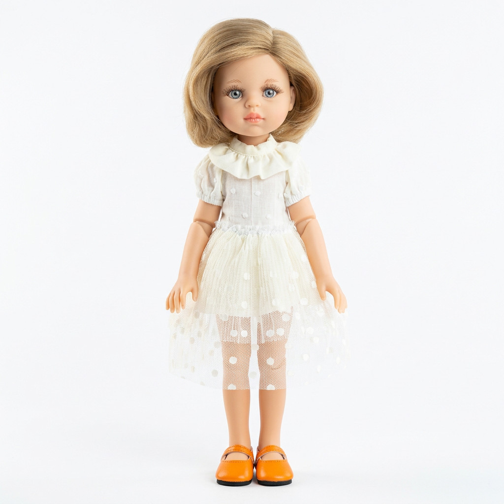 A Paola Reina Clara baba 32 cm – alkalmi ruhában az AMIGAS ARTICULADAS kollekció egyik különleges darabja, amely nemcsak a szépségével, hanem a mozgatható ízületeivel is kiemelkedik. Finom tüllszoknyás fehér ruhája, narancssárga pántos cipője és gyönyörű, vállig érő haja kifinomult, mégis gyermekien bájos összhatást teremt. Clara tökéletes választás azoknak, akik egy játékbabában a stílust és a funkciót is keresik.
