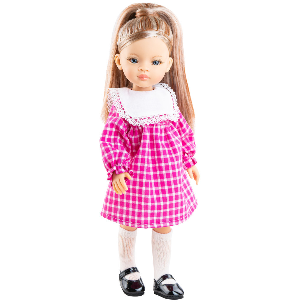 A rózsaszín kockás ruha fehér gallérral és csipkés szegéllyel nosztalgikus hangulatot idéz – mintha egy kedves régi mesekönyv lapjairól lépett volna elő. Az összeállítást fehér térdzokni és fényes fekete cipő teszi teljessé – tökéletes öltözet egy „baba-napi” iskolai vagy teadélutános szerepjátékhoz.