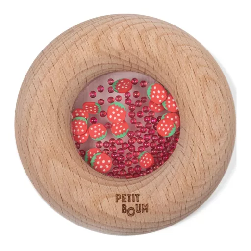 A Petit Boum Sensory Donut Eper egy egyedülálló érzékszervi játék, amely természetes anyagokkal és vizuálisan izgalmas részletekkel támogatja a baba fejlődését. A simára csiszolt bükkfa gyűrű könnyen megfogható, így tökéletes az apró kezek számára. A belsejében lévő élethű eper szeletek és színes gyöngyök finom csörgő hangot adnak, amely fejleszti a hallásérzékelést és nyugtató hatással van a kicsikre.