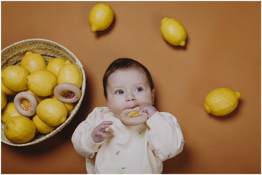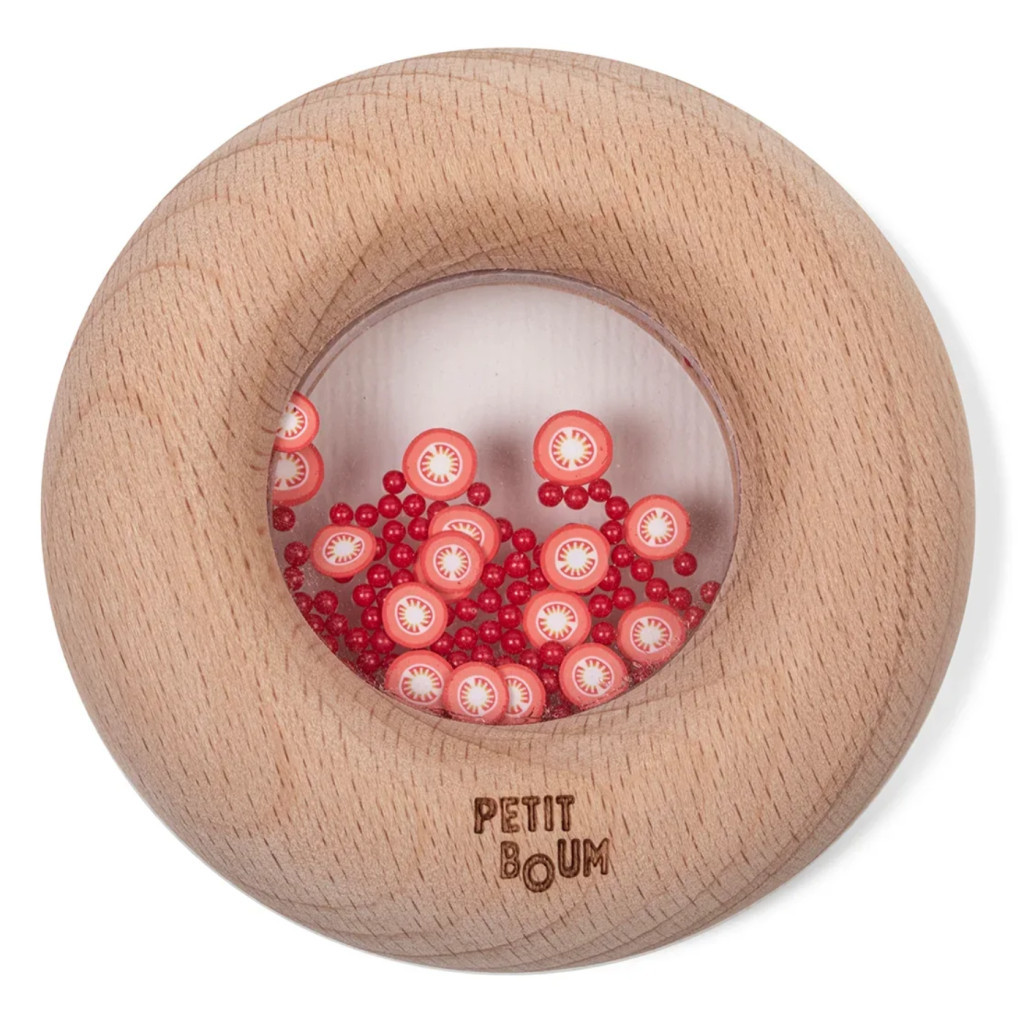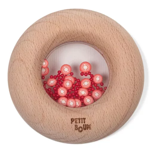 A Petit Boum Sensory Donut Paradicsom egy különleges érzékszervi játék, amely segíti a babák látási, tapintási és hallási fejlődését. A simára csiszolt bükkfa gyűrű tökéletesen illeszkedik a kis kezekbe, miközben a belsejében lévő élethű paradicsomszeletek és mozgó gyöngyök finom csörgő hangot adnak. Ez a fogzásbarát játék nemcsak esztétikus és játékos, hanem természetes antibakteriális tulajdonságai révén is biztonságos választás a babák számára.