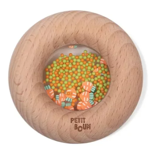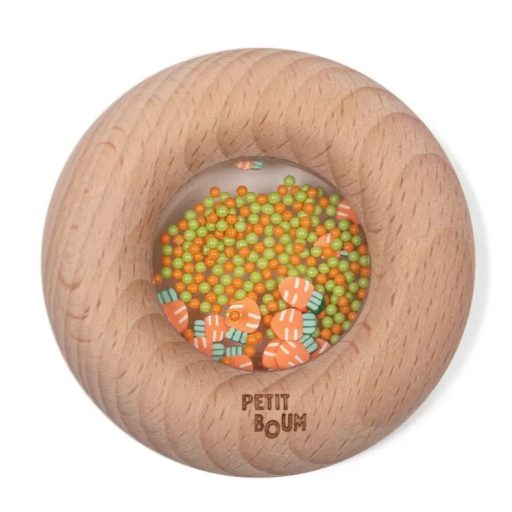 A Petit Boum Sensory Donut Répa egy különleges érzékszervi játék, amely ötvözi a természetes anyagokat és a fejlesztő játékélményt. A simára csiszolt bükkfa gyűrű belsejében narancssárga és zöld gyöngyök, valamint apró répaminták mozognak minden mozdulatra. A kellemes csörgő hang, a színes elemek és a fa tapintása együtt serkentik a baba érzékszervi fejlődését, miközben természetes módon megnyugtatják.