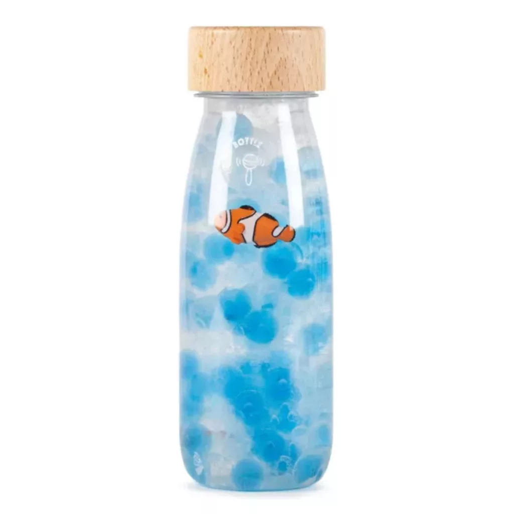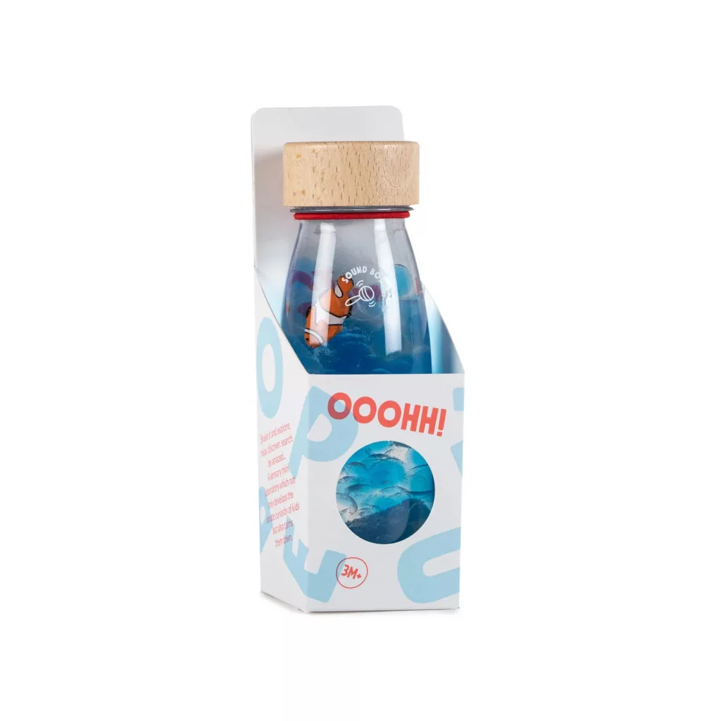 A Petit Boum Sound Bottle bohóchal egy különleges érzékszervi játék, amely egyszerre nyújt vizuális és auditív élményt a legkisebbek számára. A palack belsejében egy vidám bohóchal úszkál a kék buborékok között.