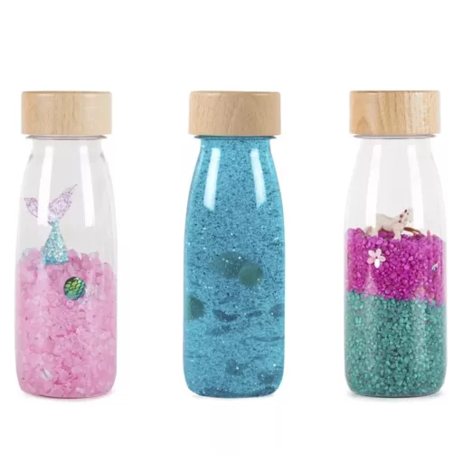 - Float Bottle Turquoise – Egy lebegő palack tele irizáló csillámokkal és színpompás gyöngyökkel, amely elbűvölő fényhatásokkal segíti a koncentráció fejlődését.