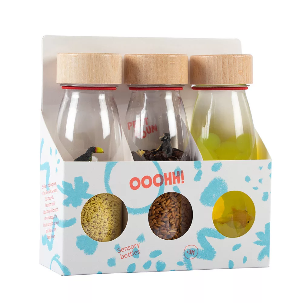 - Sound Bottle Toucan – Egy vibráló színű palack, amelyben egy tukán rejtőzik. A rázás során kellemes csörgő hangot ad, amely stimulálja a hallást.