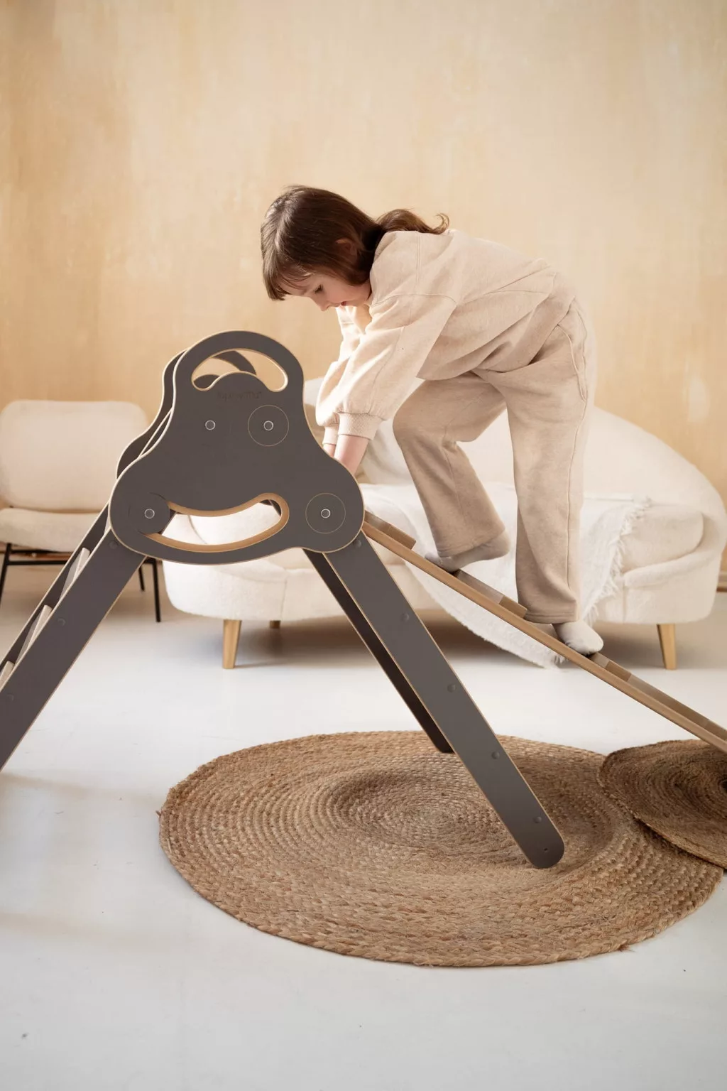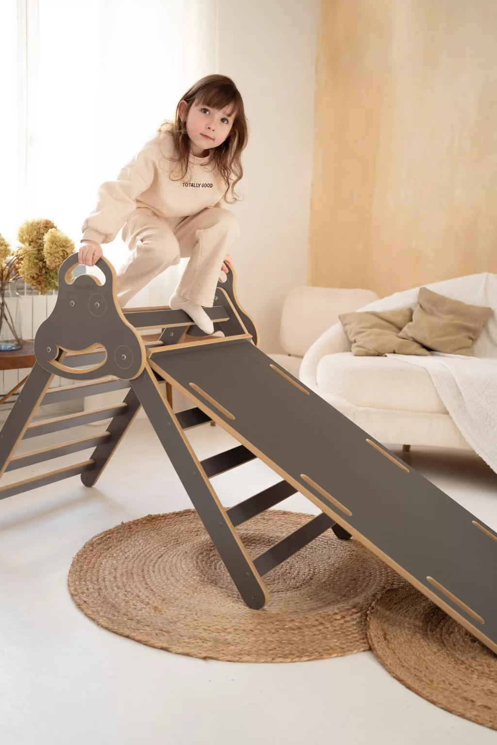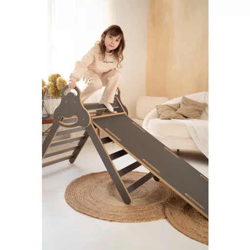 A csúszda egyik oldala sima, másik oldala mászótábla kapaszkodókkal, így mindig az adott mozgásszinthez igazítható. A lejtő könnyen csatlakoztatható a Pikler mászókához, vagy akár más Tupti.wood hintához is – így építhető ki belőle egy összekapcsolható mozgáspálya otthon.