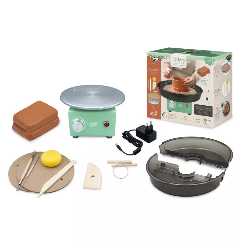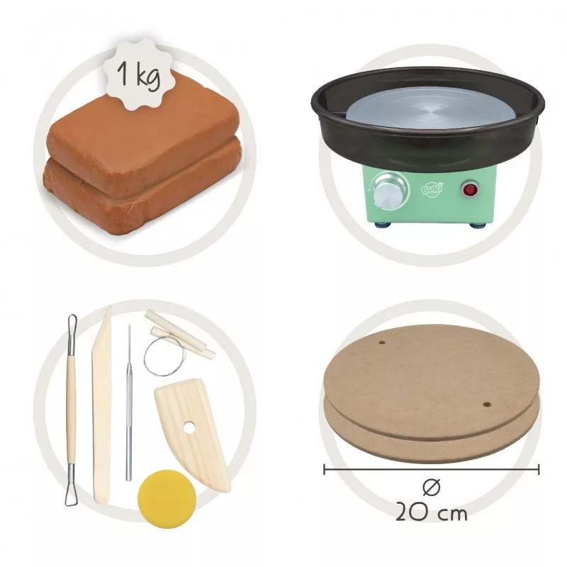 Igazi professzionális fazekas készlet, ami bemutatja a gyerekeknek és felnőtteknek a korongozási technikákat. A korong percenként 220 fordulatot tesz meg, így simán és pontosan lehet vele formázni. A 20 cm átmérőjű fém kerámia korongfej minden méretű alkotás elkészítésére alkalmas. Két kerámia alátét is található a csomagban, így az elkészült alkotásokat le lehet venni száradni, és közben újakat létrehozni. A korong mindkét irányba forog, így bal- és jobbkezesek egyaránt használhatják. A levehető fröccsenésgátló tálca megkönnyíti a tisztítást.