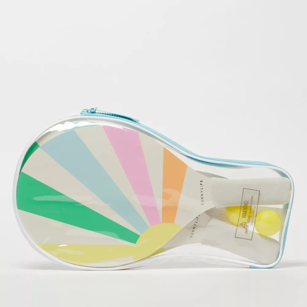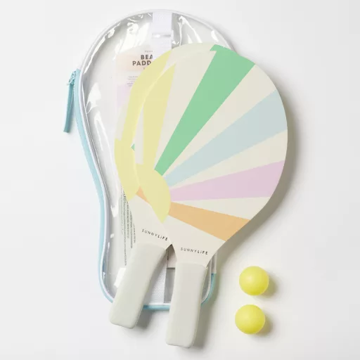 A Sunnylife Strandtenisz Szett - Pastel Gelato tökéletes módja annak, hogy élvezd a nyári napokat, legyen szó akár a strandon, akár otthoni kertben történő játékról. Vigyed magaddal, hová csak szeretnéd, és élvezd az egyszerű, mégis stílusos szórakozást, amit ez a szett nyújt. Készülj fel az egész napos játékra és a jó hangulatra ezzel a színes és vidám strandtenisz szettel!