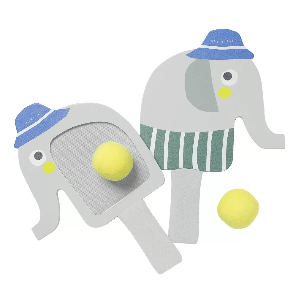 Képzeld el azt a jellegzetes, reccsenő hangot, ahogy a bolyhos teniszlabda telibe találja a színes tépőzáras felületet! Az élénk, vidám tónusok és a kedves Eli elefánt figura azonnal játékra hívnak. A könnyű, de masszív anyagoknak köszönhetően a tárcsák tökéletesen és kényelmesen simulnak a kis kezekbe, a hátoldalon található pánt pedig biztosítja, hogy egyetlen izgalmas dobásnál se csússzon ki a kezükből. Ez az egyedi szett zseniális választás a Sunnylife felfújható strandcikkei vagy a pihe-puha kapucnis poncsóink mellé, ha egy igazán teljes nyári felszerelést keresel.