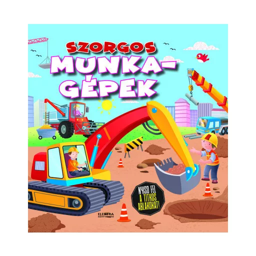 Különböző munkagépeket mutat be a gyerekeknek, kihajtható ablakokkal, a gépek feladataira visszakérdező visszatérő kérdésekkel.