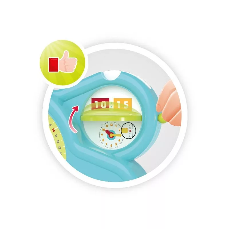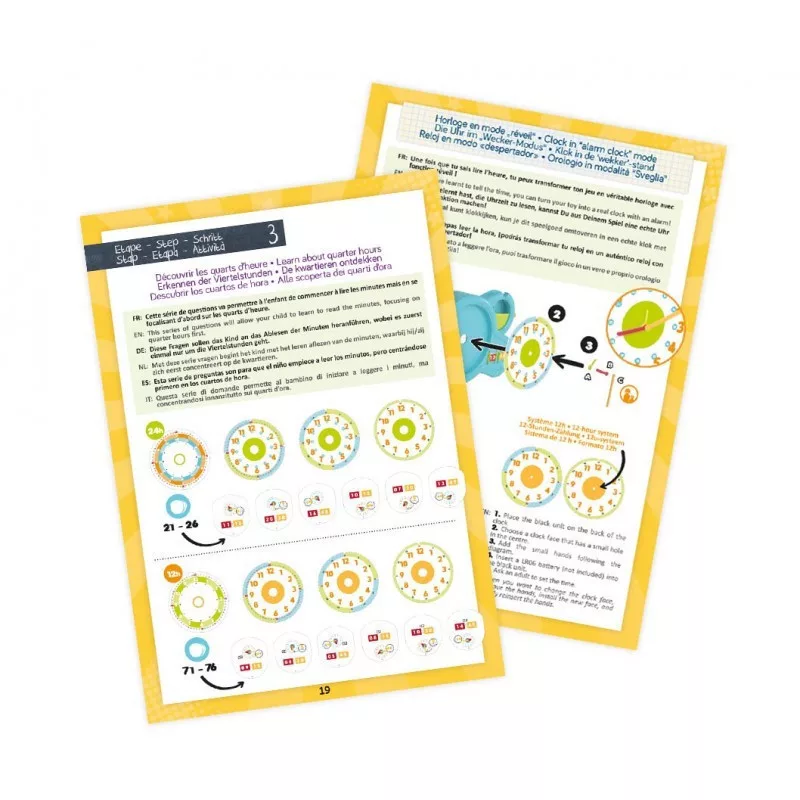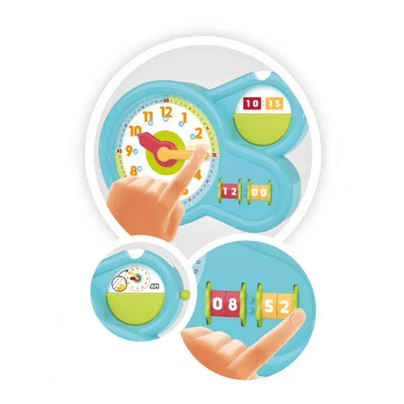 A 24 órás és a 12 órás (AM/PM) rendszer szerinti időolvasás megtanulására van lehetőgés.