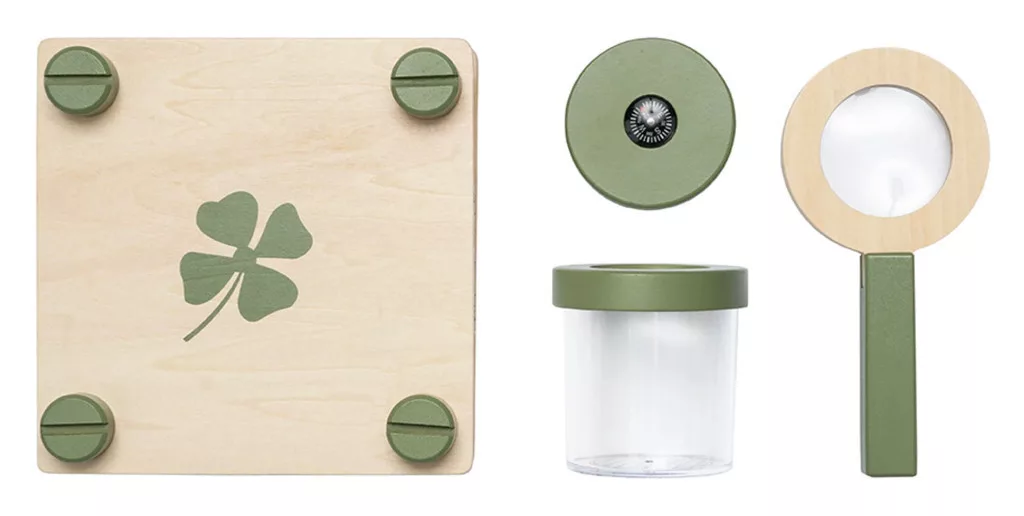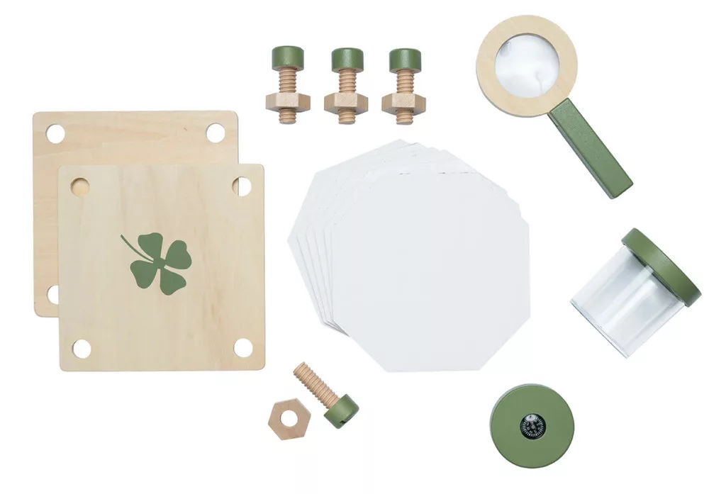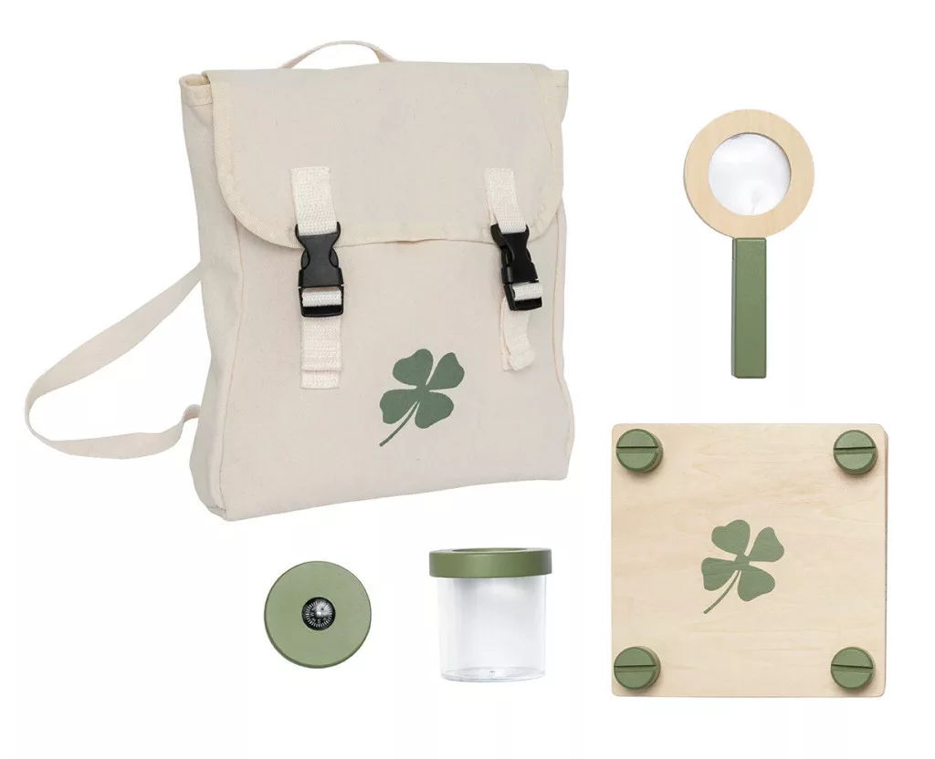 Vár rád a kaland! Ebben az okos és stílusos hátizsákban minden benne van, amire egy fiatal felfedezőnek szüksége van ahhoz, hogy elmerüljön az erdő apró és nagy rejtelmeiben. A nagyítótól a rovartartó üvegen át az iránytűig - minden eszköz gondosan össze lett válogatva, hogy a kirándulás izgalmas és játékos kalanddá váljon!