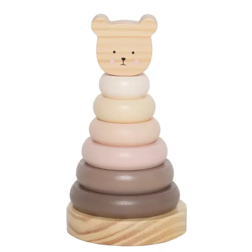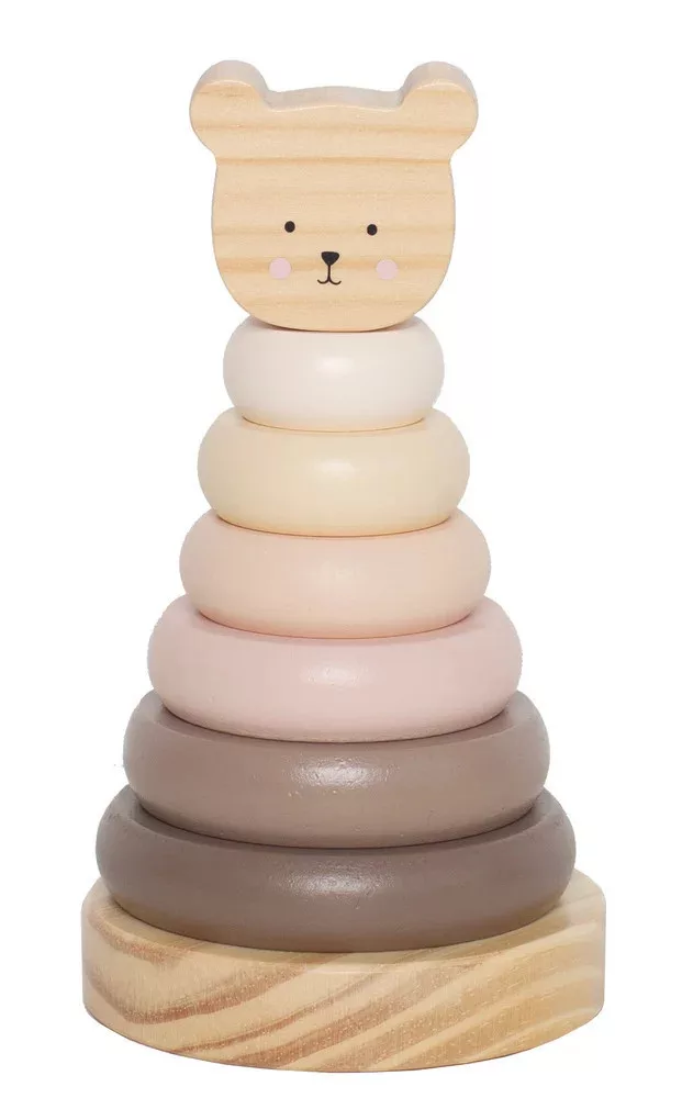 Ez a toronyépítő különböző színű karikákból áll, tetejét egy macifej díszíti. A játék megtanítja a gyermek számára a formák, színek és méretek megkülönböztetését. Fejleszti a kéz-szem koordinációt és a finommotorikát. A toronyépítő hajlítható a legnagyobb biztonság érdekében.