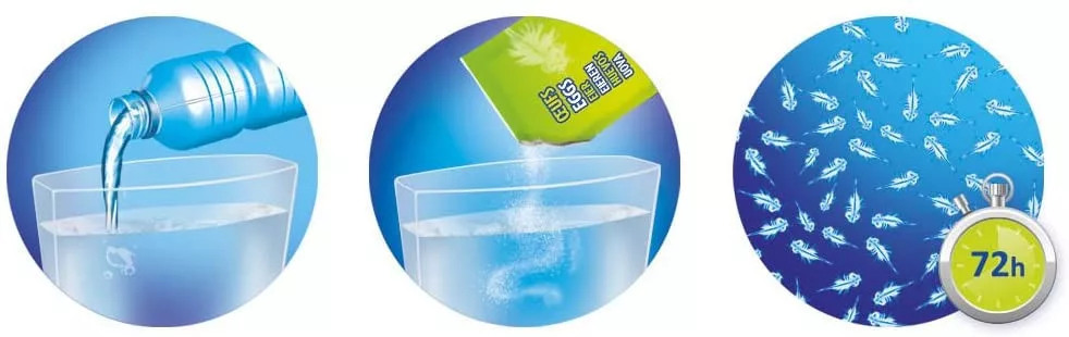 - tölts palackozott vizet az akváriumba (szénsav mentes!) majd öntsd a tojásokat tartalmazó zacskó tartalmát a vízbe.
