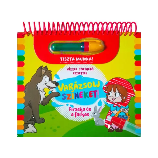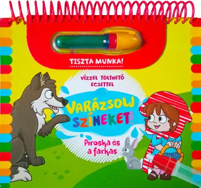 A Varázsolj színeket! - Piroska és a farkas egy varázslatos, kreatív foglalkoztatókönyv, amely a klasszikus mese világába kalauzolja a gyerekeket. A jól ismert történet kedves jelenetei, barátságos illusztrációk formájában jelennek meg. A könyv különlegessége, hogy a képek a mellékelt, vízzel tölthető toll segítségével kelnek életre: a színek fokozatosan bukkannak elő, mintha igazi varázslat történne.