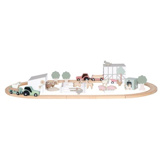 Ezzel a Jabadabado klasszikus fából készült vasúti pályával és a komplett farm kiegészítőkkel garantált a szórakozás! Építsd össze a síneket, és helyezd el a három házat a sínek mentén; egy csűrt, egy kutyaházat és egy istállót, amelymentén a traktorok el- vagy áthaladhatnak. Menet közben láthatod, hogy az állatok a karámjukban legelésznek a fák árnyékában. Kínáld meg a teheneket szénával, és engedd, hogy a lovacska megkóstolja a finom répát és az almát is!