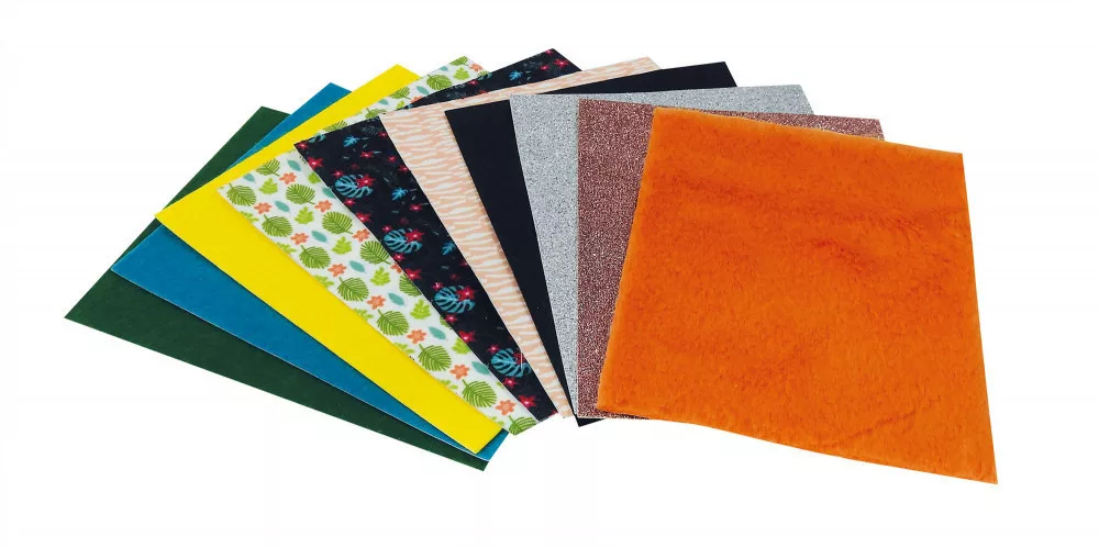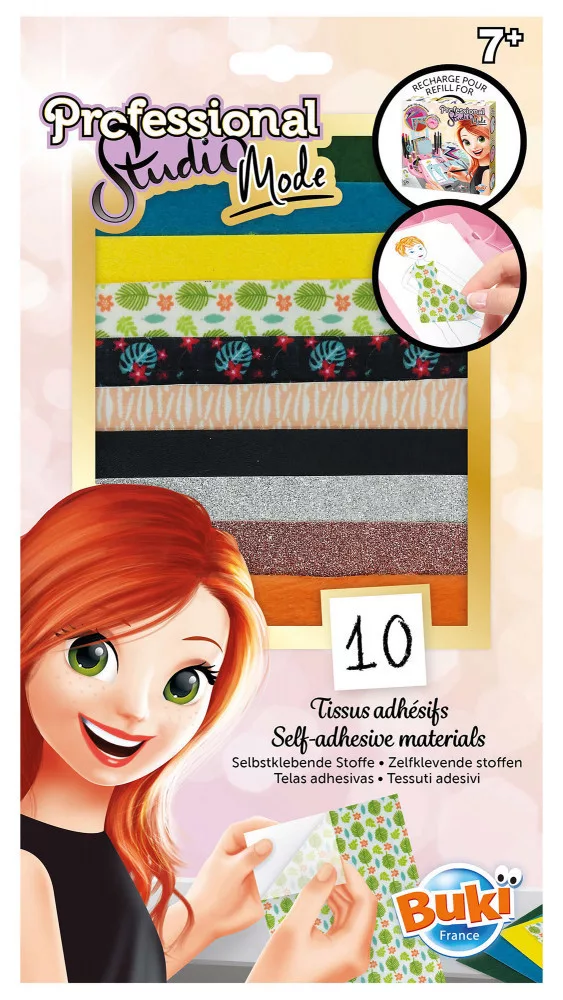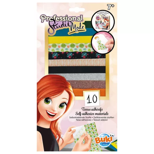 Öntapadós anyagok a Buki Professzionális divattervező készletének újratöltéséhez! Tartalma 10 féle öntapadós anyag: szőrme, csillogó textil, műbőr, nyomott mintás pamut, filc.